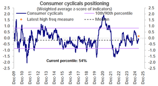 Wraz ze spadkiem obaw geopolitycznych inwestorzy dyskrecjonalni odwrócili spadek z zeszłego tygodnia i obecnie są na poziomie neutralnym (-0,03 odchylenia standardowego, 43. percentyl). Strategie systematyczne również zwiększyły ekspozycję w tym tygodniu, ale nadal pozostają niedoważone (-0,31 odchylenia standardowego, 30. percentyl).